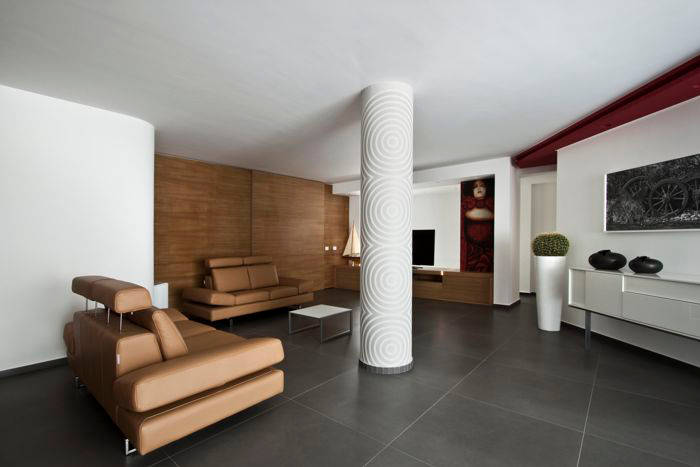 Si sviluppa su una superficie complessiva di circa 240mq ed è caratterizzato da un ampio open space nella zona giorno con al centro un imponente volume cubico in legno, contenente il guardaroba e che scandisce il grande spazio living; da qui si accede alla zona notte e alla sala da pranzo collegata, attraverso un’ampia vetrata ad un cortile interno più privato.