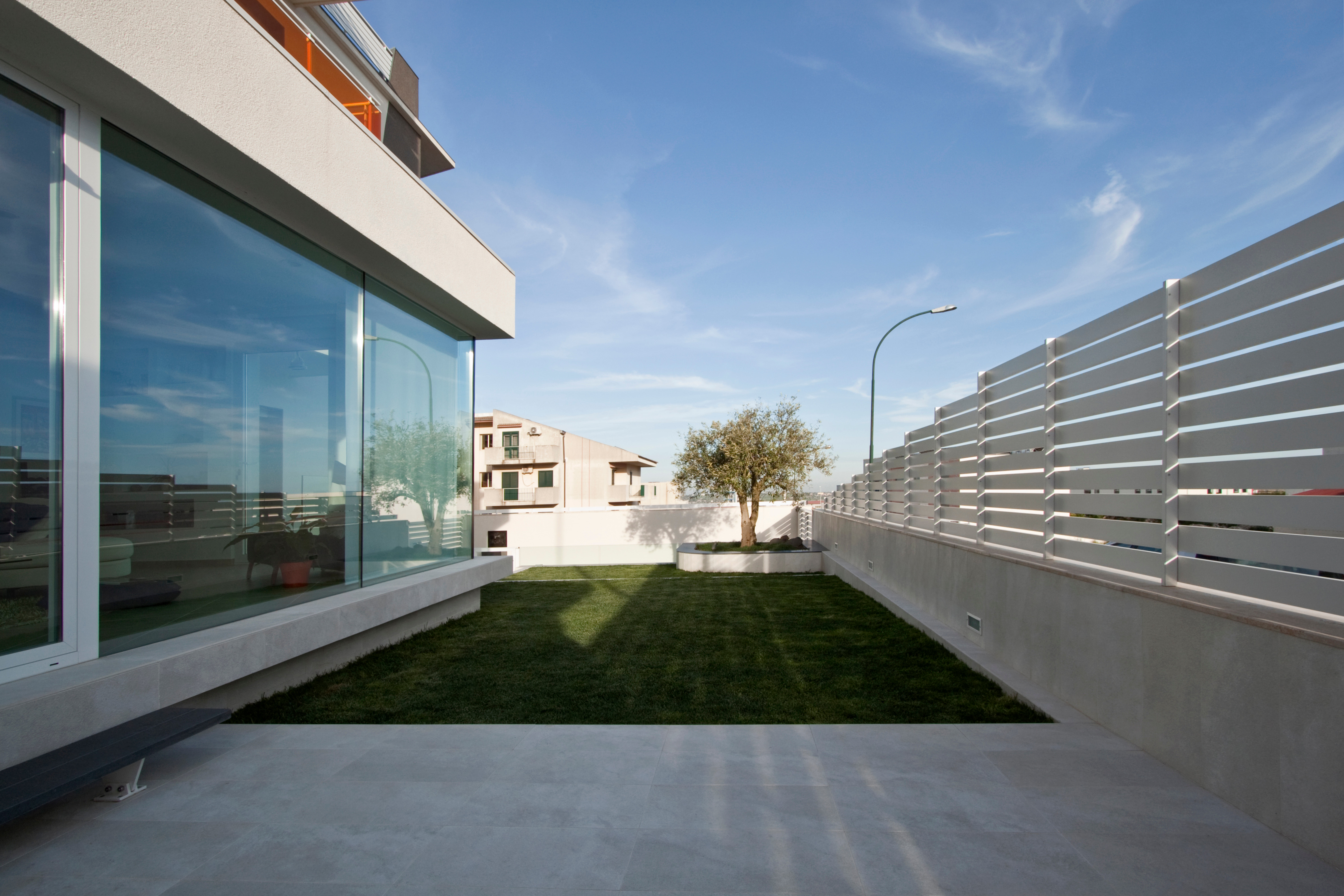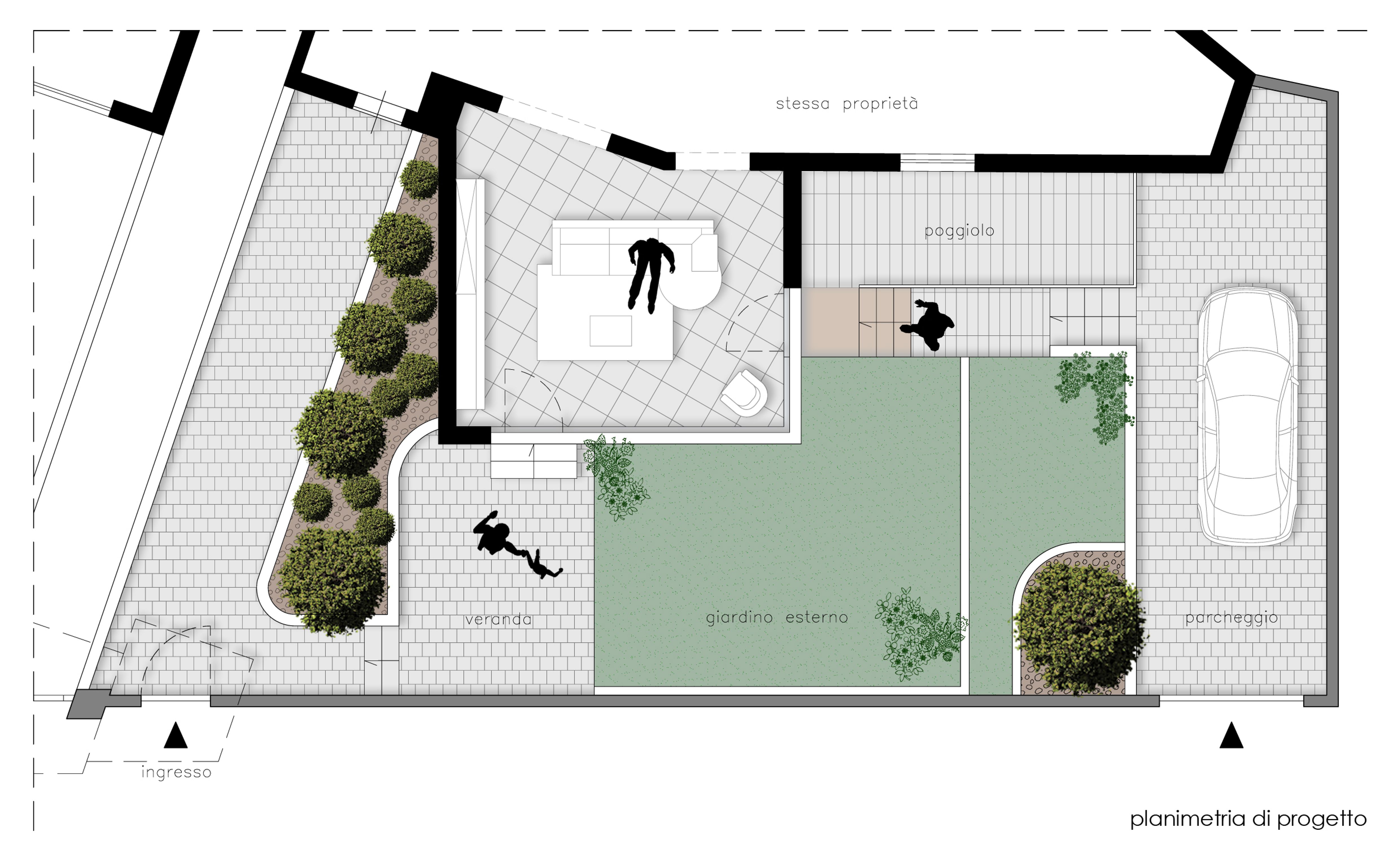 Il progetto ha riguardato la sistemazione esterna e la creazione di un giardino d'inverno a servizio di un appartamento al piano terra ad un edificio residenziale plurifamiliare su tre livelli.